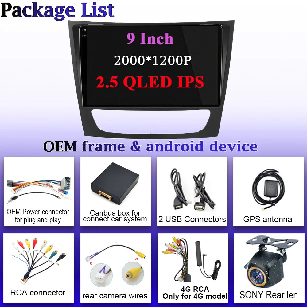 Autoradio Android compatible CarPlay et Android Auto pour Classe E W211 : 215(L)*50(W)*134(H) mm, autoradio à écran tactile HD fluide et réactif capacitif de 9 pouces, équipé d'un Quad Core 4GB RAM et 64GB ROM. Vous offre une expérience plus rapide et plus fluide. Haute résolution 1024*720.